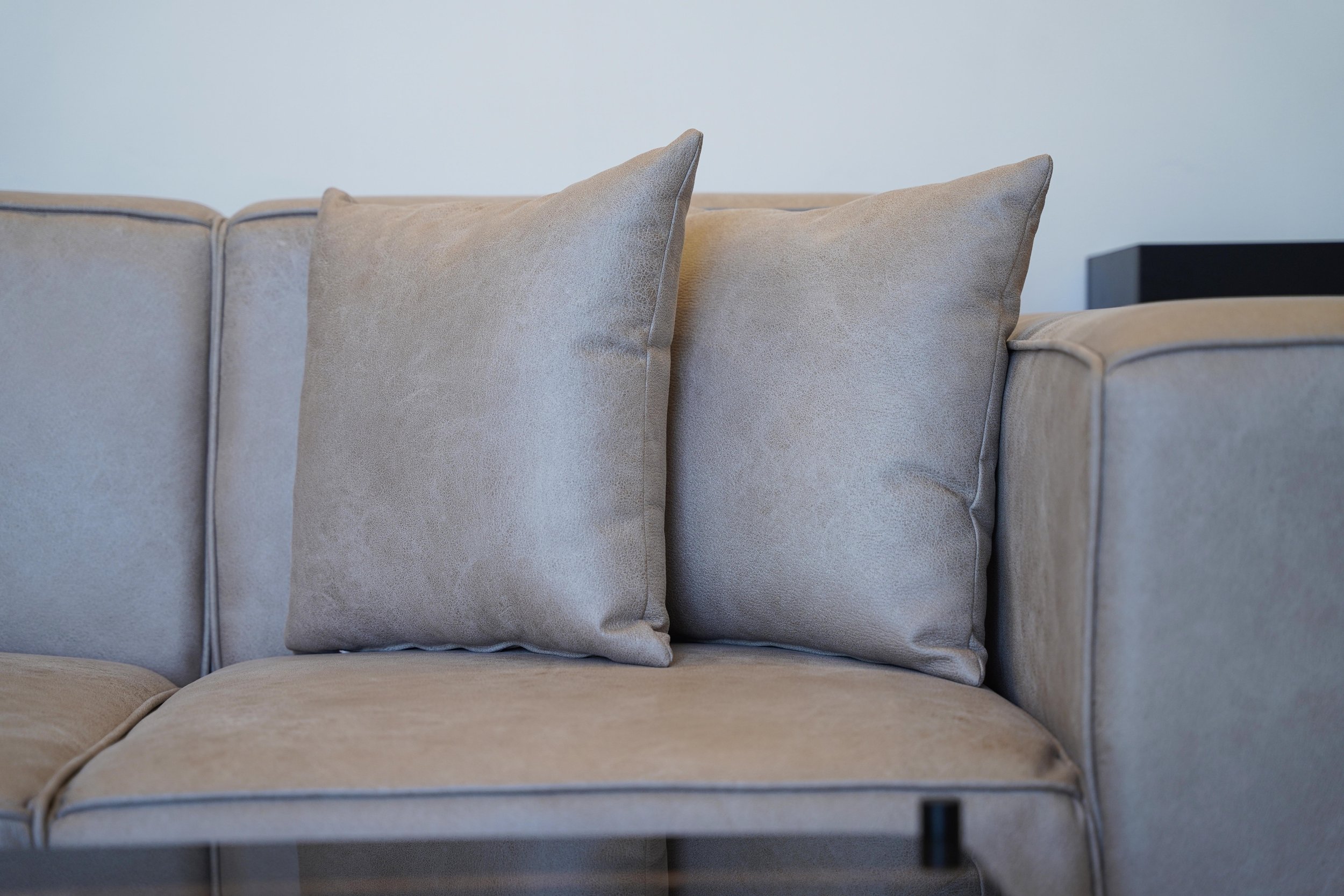 A cubic straight corner corner, that is bulky yet straight forward with a basic greige color with a twist in the orange pillow colors gives the room a beautiful feel. The central tables with the black metal legs and black top with thin beautiful orange lines are a beautiful contrast with the corner.