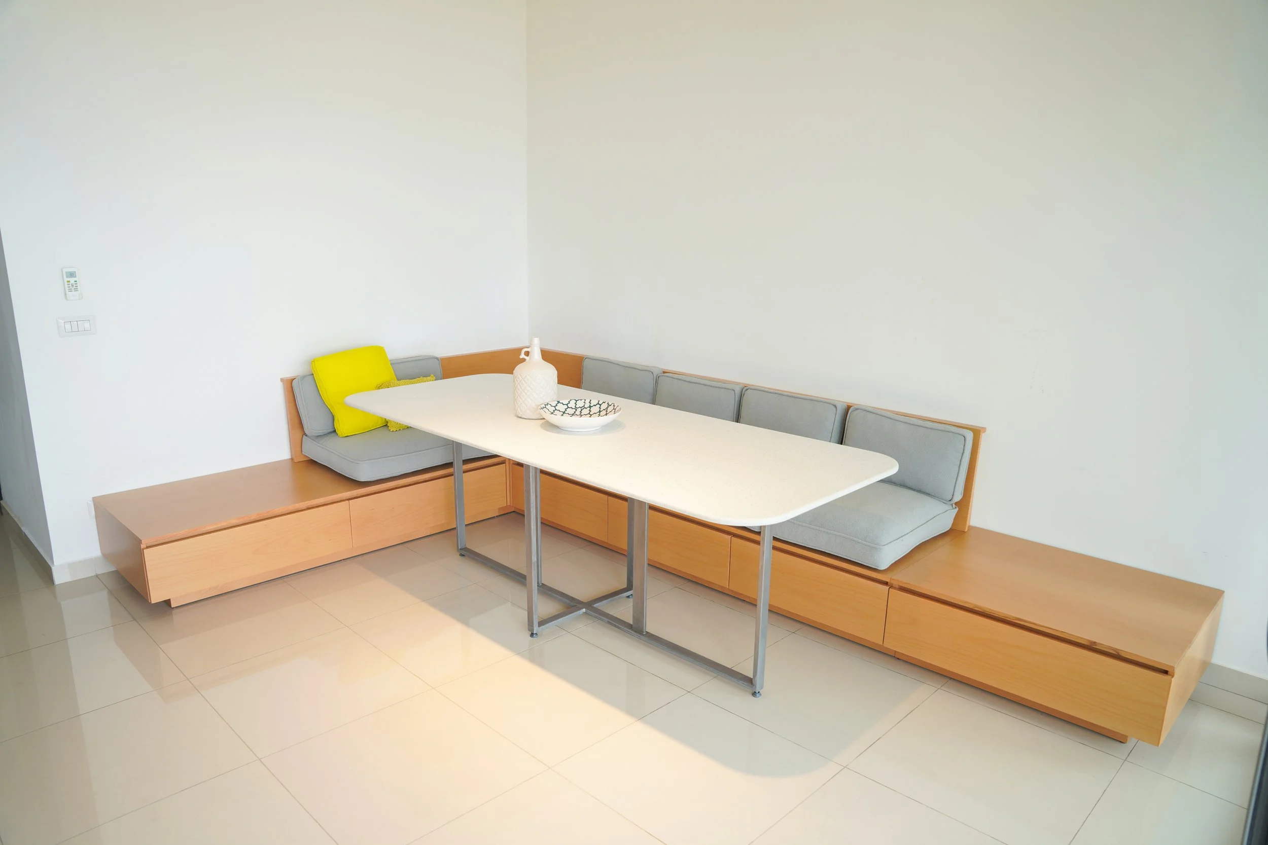 What a unique combination of a living and dining space. Customized to provide a comfortable seating area and extra storage drawers beneath. The beech veneer, gives a fresh look to the space specially with its light color. The details of the back with the recessed side was all taken into consideration in the design.